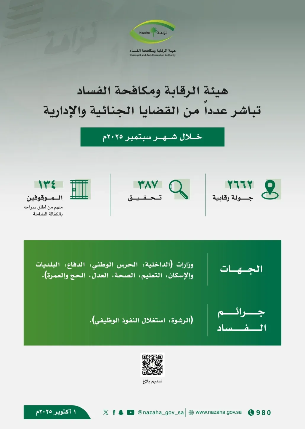 أعلنت هيئة الرقابة ومكافحة الفساد، المعروفة باسم “نزاهة”، عن مباشرتها عددًا من القضايا الجنائية والإدارية خلال شهر سبتمبر 2025، حيث شملت التحقيق مع 387 موظفًا ومشتبهًا به، وإيقاف 134 متهمًا، بينما أُطلق سراح البعض بكفالة ضامنة، هذه التحركات تأتي في إطار جهود الهيئة لمحاربة الفساد وتعزيز الشفافية في جميع القطاعات.