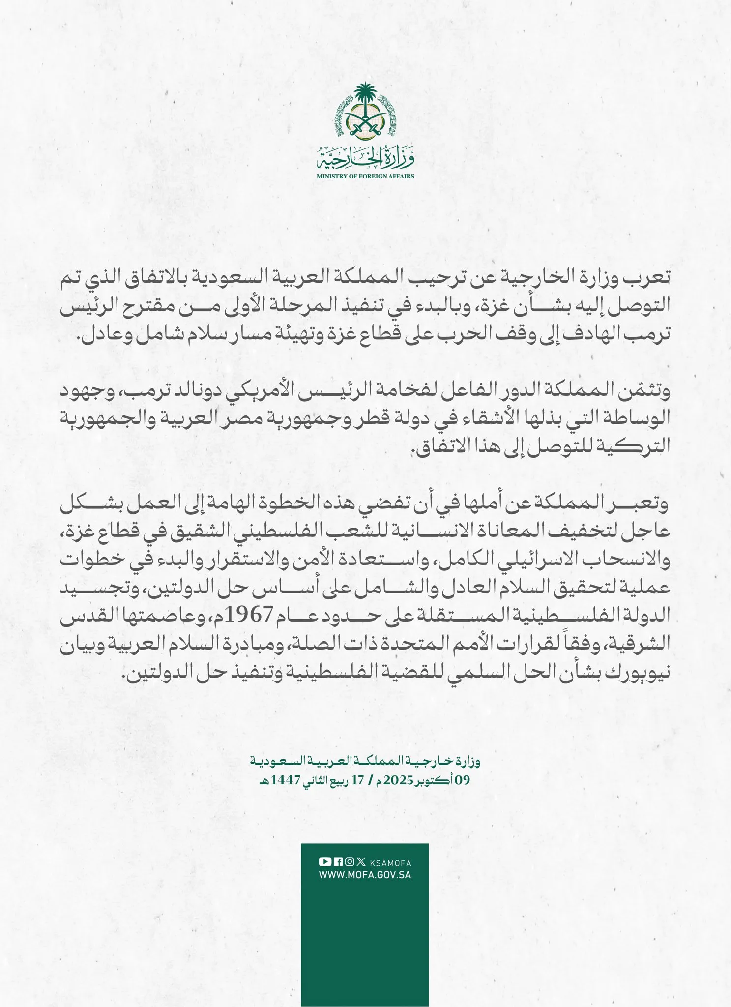 أعربت وزارة الخارجية عن ترحيب المملكة العربية السعودية بالاتفاق الذي تم التوصل إليه بشأن غزة، حيث تم البدء في تنفيذ المرحلة الأولى من مقترح الرئيس الأمريكي دونالد ترمب الهادف إلى وقف الحرب على قطاع غزة، وتهيئة مسار سلام شامل وعادل، هذا الاتفاق يأتي في وقت حساس ويعكس التزام المملكة بالسلام في المنطقة.